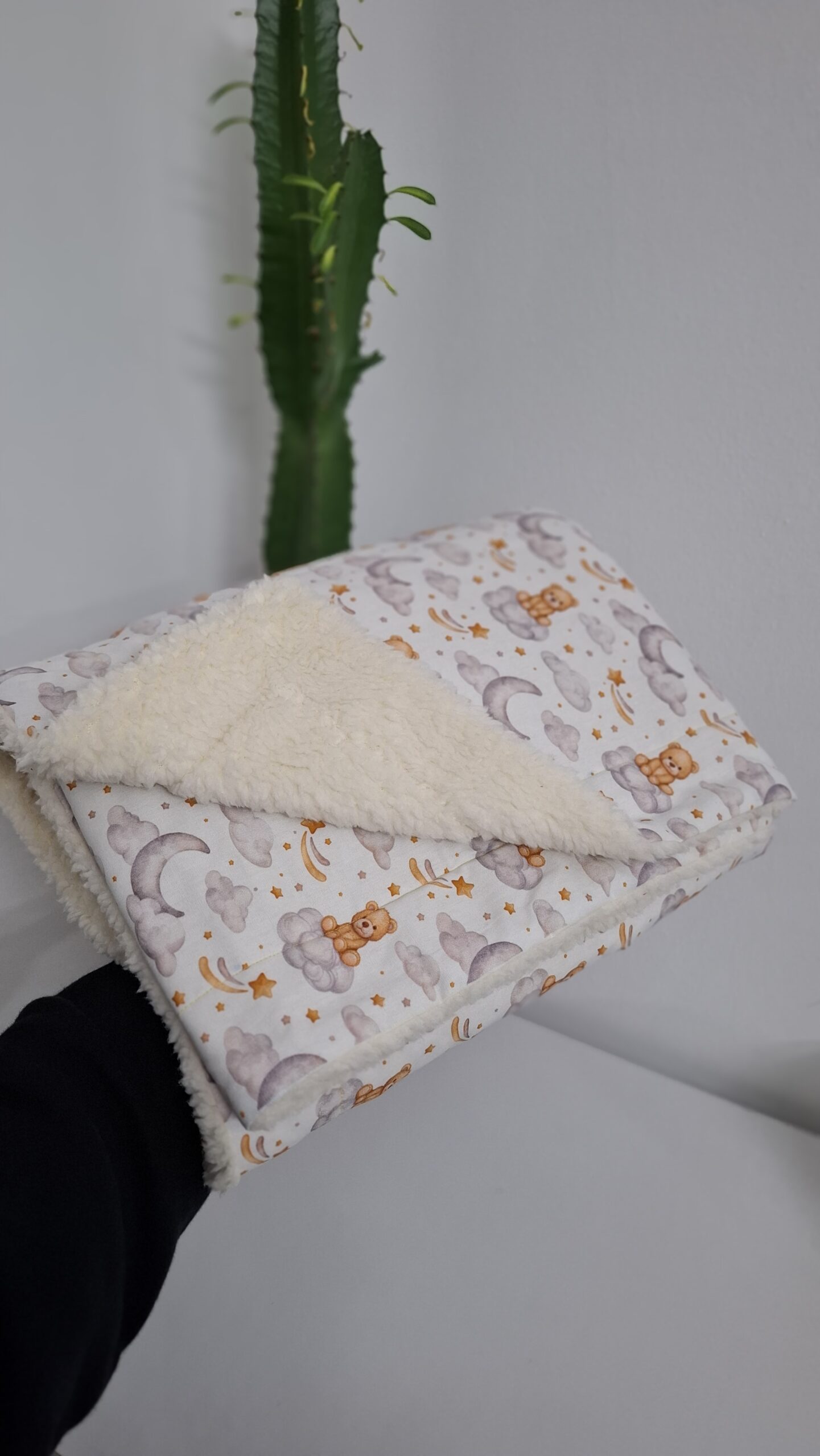 A mantinha é produzida com tecido tricoline suave na parte externa e forro de cordeirinho antialérgico na parte interna, garantindo conforto térmico e extremo aconchego. Ideal para usar no berço, carrinho, bebê conforto ou no colo, envolvendo o bebê com carinho e proteção.