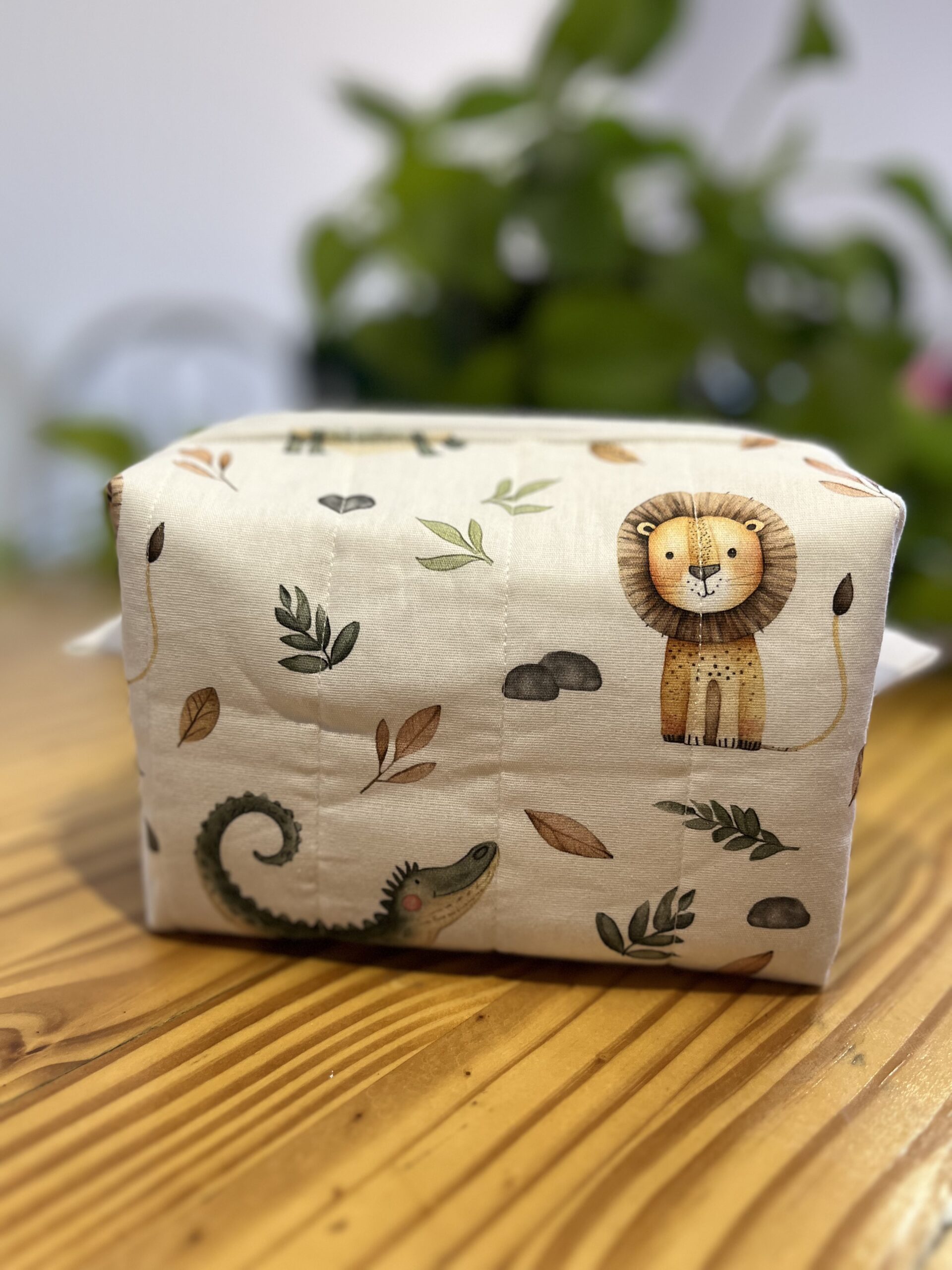 Possui revestimento interno impermeável, facilitando a limpeza e protegendo os itens contra umidade e pequenos vazamentos. Espaçosa, resistente e com acabamento cuidadoso, é perfeita para viagens, passeios ou para manter tudo organizado na bolsa maternidade, no quarto ou no banheiro 🤍